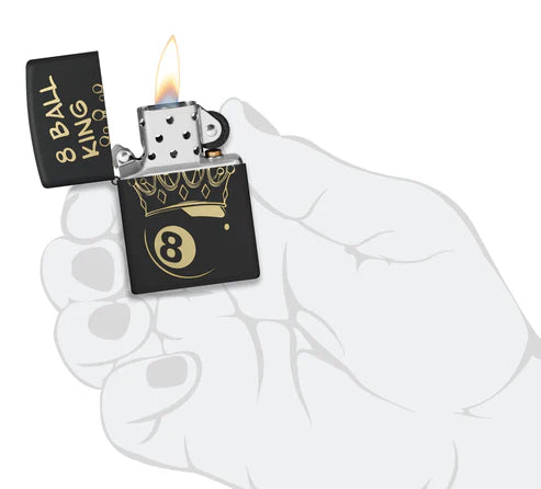Perfecto para cualquier campeón de billar, este encendedor clásico negro mate presenta un diseño grabado con láser de una bola ocho adornada con una corona. Viene empaquetado en una caja de regalo. Para un rendimiento óptimo, llénelo con combustible para encendedores Zippo.