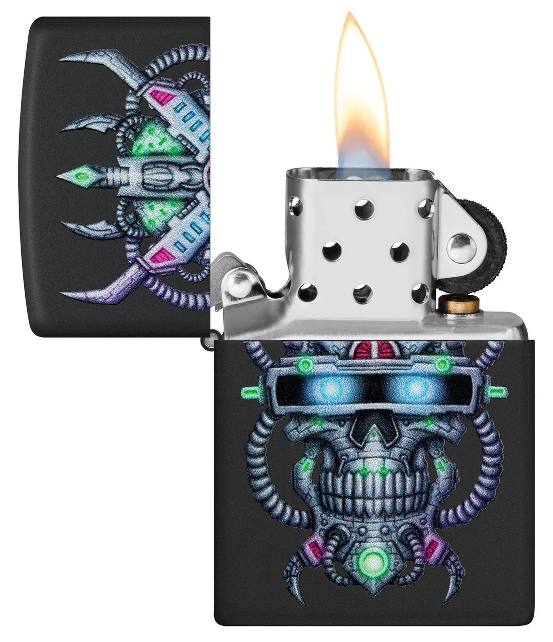Este diseño de calavera cibernética es el material de las pesadillas futuristas. Un centro de comando biónico zumba con circuitos vibrantes en este diseño de imagen en color, que parece brillar contra el encendedor negro mate. Viene empaquetado en una caja de regalo. Para un rendimiento óptimo, llénelo con combustible para encendedores Zippo.