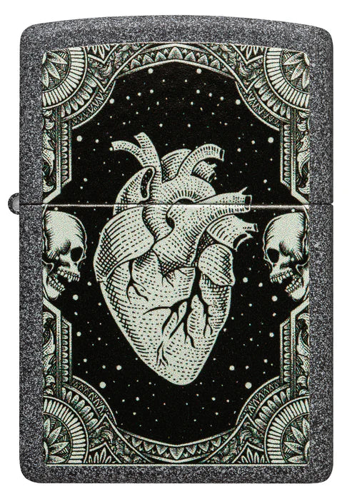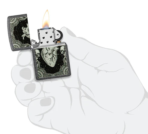 Un encendido clásico de Iron Stone es el telón de fondo perfecto para esta escena romántica y oscura de Color Image, que presenta un detallado corazón suspendido dentro de un borde ornamentado y flanqueado por un par de esqueletos. Viene empaquetado en una caja de regalo. Para un rendimiento óptimo, llénelo con combustible para encendedores Zippo.