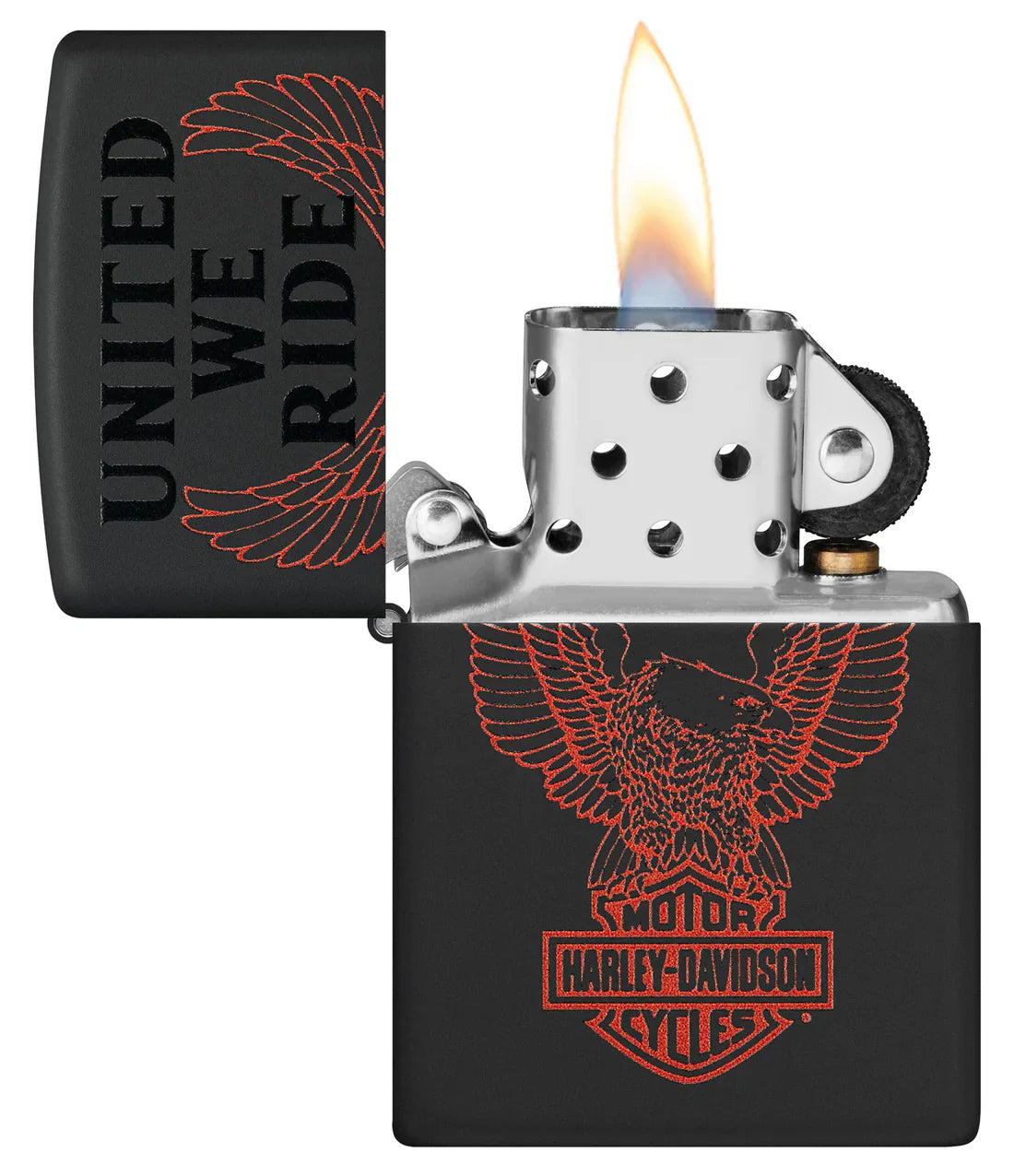 Con el logo del águila Harley-Davidson® y la inscripción "United We Ride", este encendedor clásico en negro mate con un diseño atrevido de Color Image está dominado por la superficie. Viene empaquetado en una caja de regalo. Para un rendimiento óptimo, llénelo con combustible para encendedores Zippo.