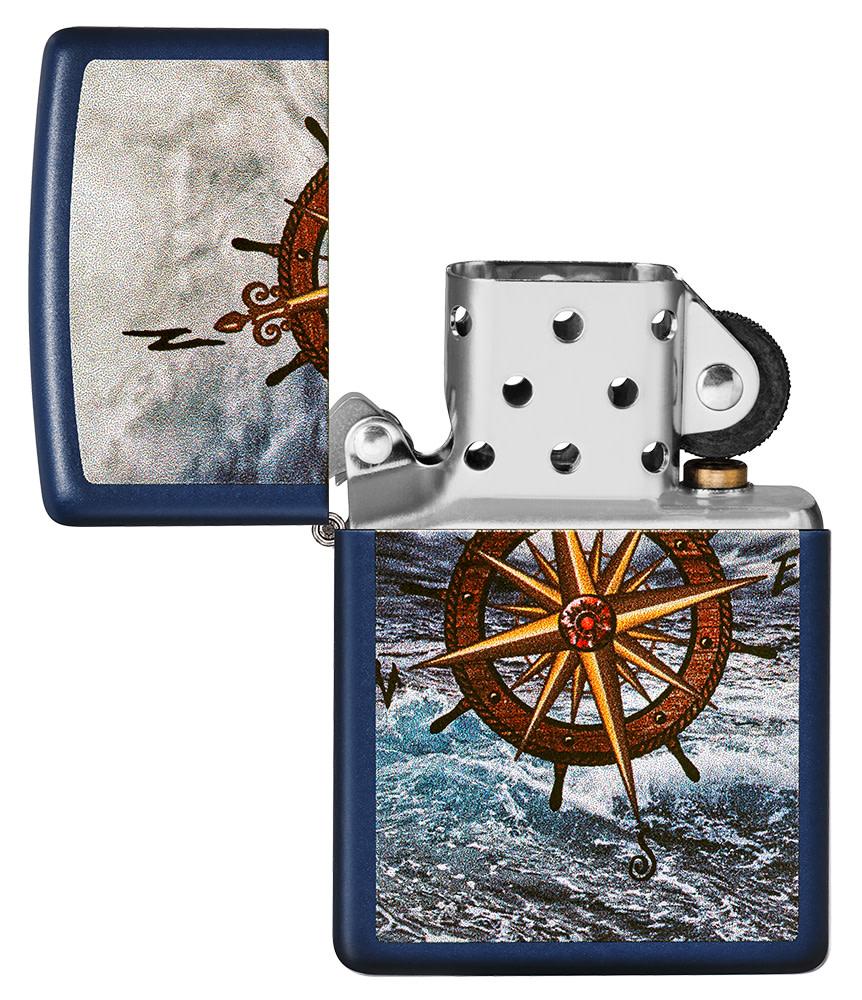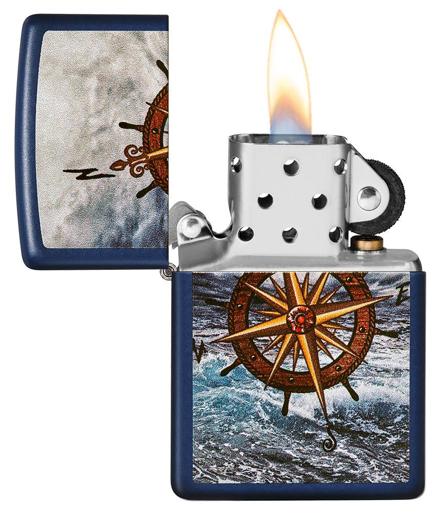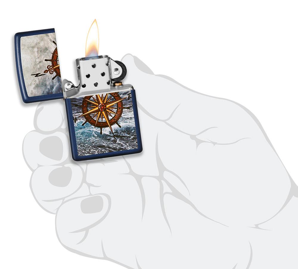 Cuando estás en mar abierto, tu brújula es tu mejor amiga. Esta brújula náutica tiene una imagen en color en un encendedor azul marino mate, con el mar abierto furioso de fondo. ¡Tu aventura te espera! Viene empaquetado en una caja de regalo. Para un rendimiento óptimo, llene con combustible para encendedor Zippo.